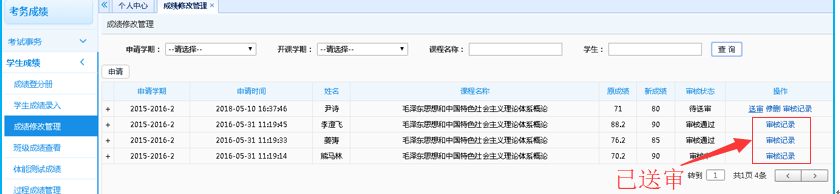 (注意:成绩修改后要在成绩修改管理界面点击“送审”,送审至对应经理审核后,对应的经理才能看到申请信息)