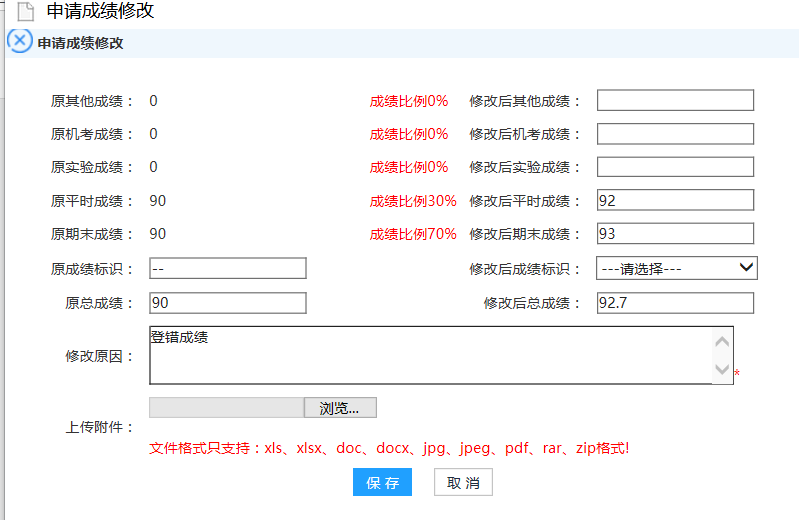 步骤3. 点击【修改】,进入成绩修改界面,录入修改后的新成绩与修改原因后,点击【保存】。
