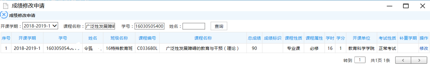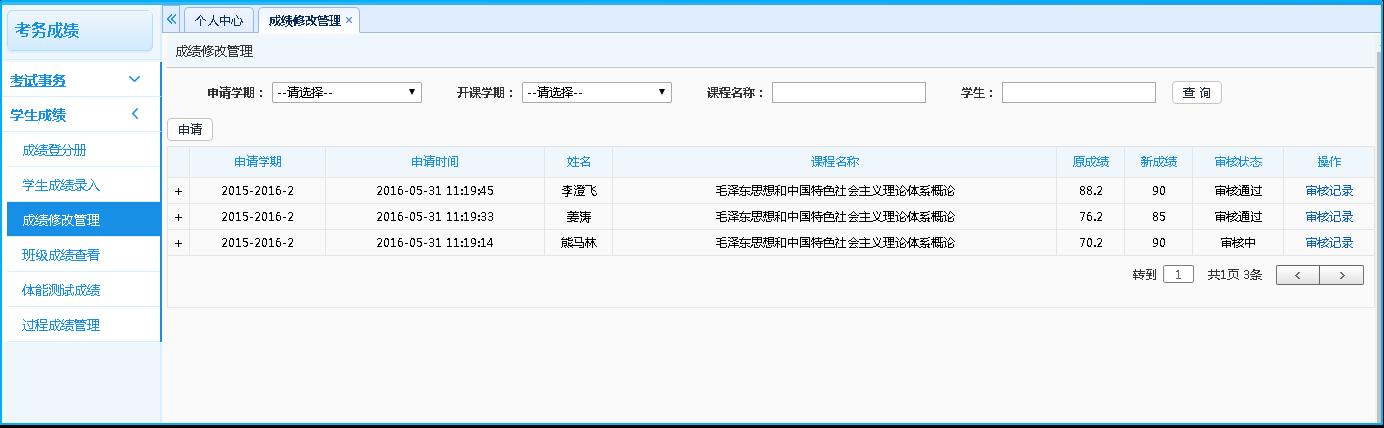 步骤2. 点击【申请】按钮,进入成绩修改申请页面,选择“开课学期、课程名称、员工或学号”等查询条件,点击【查询】,打开成绩修改管理列表页面。