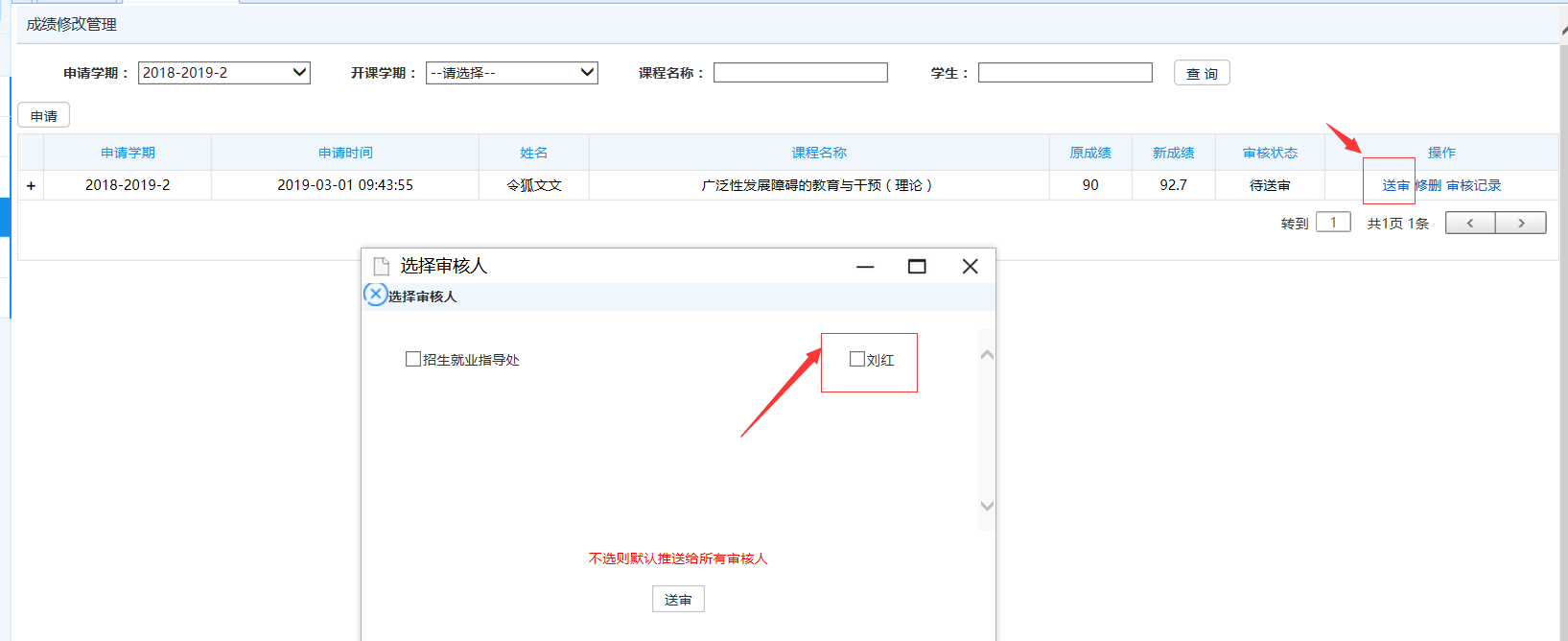步骤4. 返回成绩修改管理列表页面,在对应的成绩修改记录后,点击【送审】按钮,选择对应的经理审核即可,如下图成绩修改送审页面。