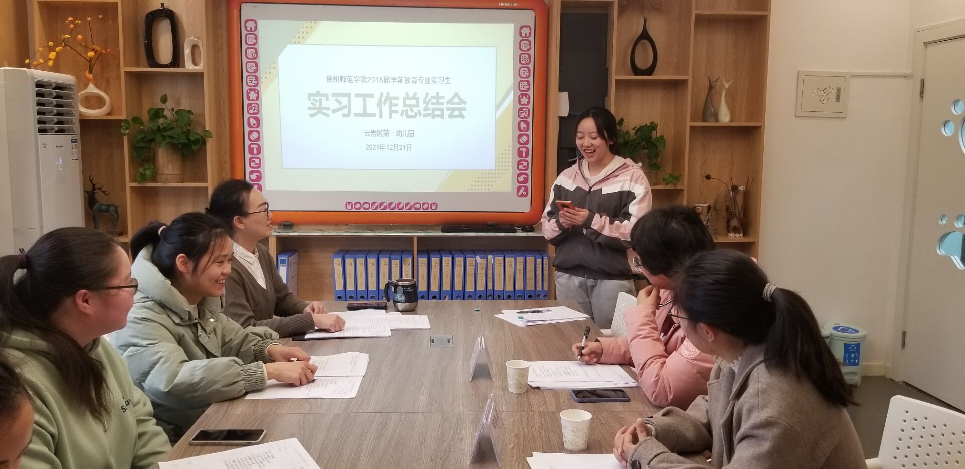本次总结会由云岩区第一幼儿园实习指导教师刘义主持。会议伊始,实习生们各自就自己一个学期的实习成果进行汇报,公司实习指导老师及幼儿园实习指导老师对员工们的授课进行了点评。