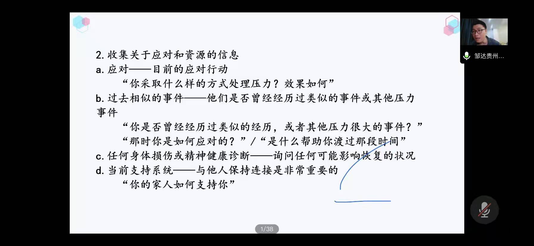 专题培训第一天上午,由贵州医科大学附属医院邹达主治医师主讲。邹达老师在《中小学心理危机干预之晤谈实操》专题中主要讲授了危机干预的五个基本元素、应对—压力的模型等,邀请培训教师根据自身情况列举近期压力事情在完成个人体验的同时,习得具体的心理危机干预工作方法。