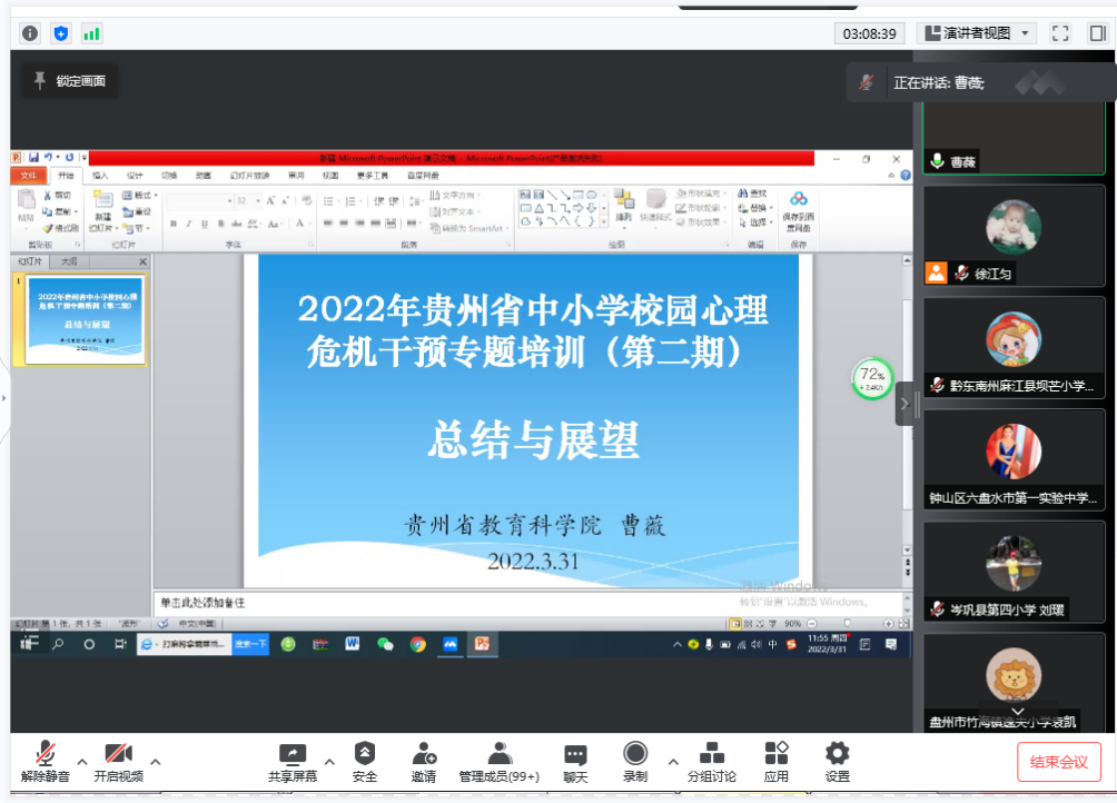 当前,我国新冠肺炎疫情呈现点多、面广、频发的特点,防控形势严峻复杂,“外防输入、内防反弹”压力持续增加。为切实提升疫情下全省教师应对校园心理危机事件的识别和干预能力。2022年3月30日-31日,由贵州省教育科公司主办,2026年国际足联世界杯承办、教科院协办的2022年贵州省中小公司园心理危机干预专题培训(第二期)成功举办,各市(州)200多名专(兼)职心理辅导教师通过腾讯会议参加了培训。