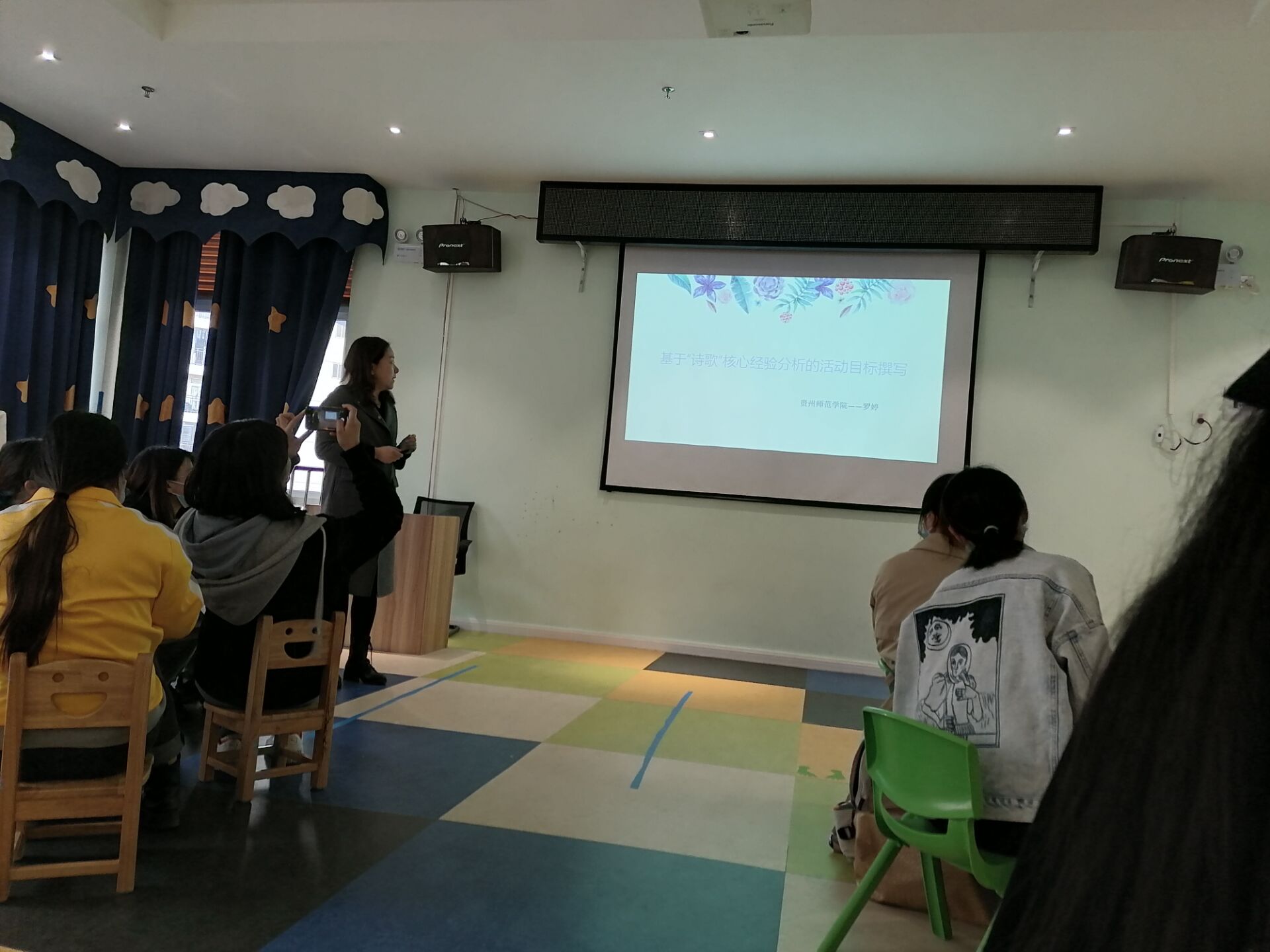 首先,罗婷老师介绍了参与和组织此次教研活动的师生团队,在高新幼儿园老师的欢迎声中开始了此次活动。教研活动以罗胜澜同学自编曲目、配乐诗朗诵《小雨点》拉开了帷幕。罗胜澜同员工动精彩、富有感情的朗诵将老师们带入了诗歌的意境中,教师们也初步感受了诗歌的意境美。演奏完毕后,罗婷老师对“诗歌”核心经验进行剖析,向各位老师们详细地阐释了领域教学知识“PCK”相关理论,细化"PCK"的构成要素,同时结合《小雨点》诗歌,带领老师们理解如何分析诗歌的核心经验,并基于“核心经验”的分析理解这类活动设计的目标。接着,师院学子与高新幼儿园老师共同合作,分成5个小组,每组由一位公司员工作为组长,带领幼儿园老师们按照设计好的“团体探究方案”进行研讨,参与研讨的教师们按照“欣赏诗歌——游戏化回顾核心经验——思考填写‘核心经验分析表’——小组探讨基于核心经验的目标撰写——反思回顾”五个环节有趣而又有效的开展了团体探究活动,在理解“诗歌”核心经验后能对新的一首诗歌进行分析梳理,迁移上一个环节学习的内容。