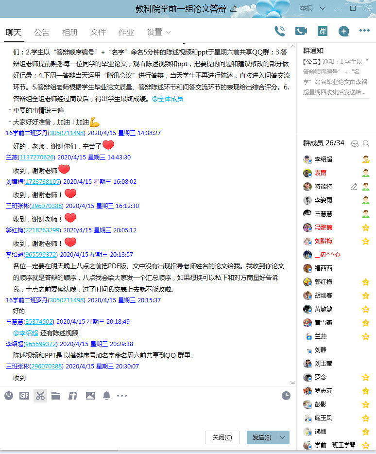 由于受疫情影响,今年的毕业论文答辩形式较为特殊,采取网络在线答辩的方式进行,全体成员都是第一次组织在线论文答辩工作,缺乏经验,因此立马创建“毕业论文答辩教师一组”QQ群,商讨答辩事宜。
