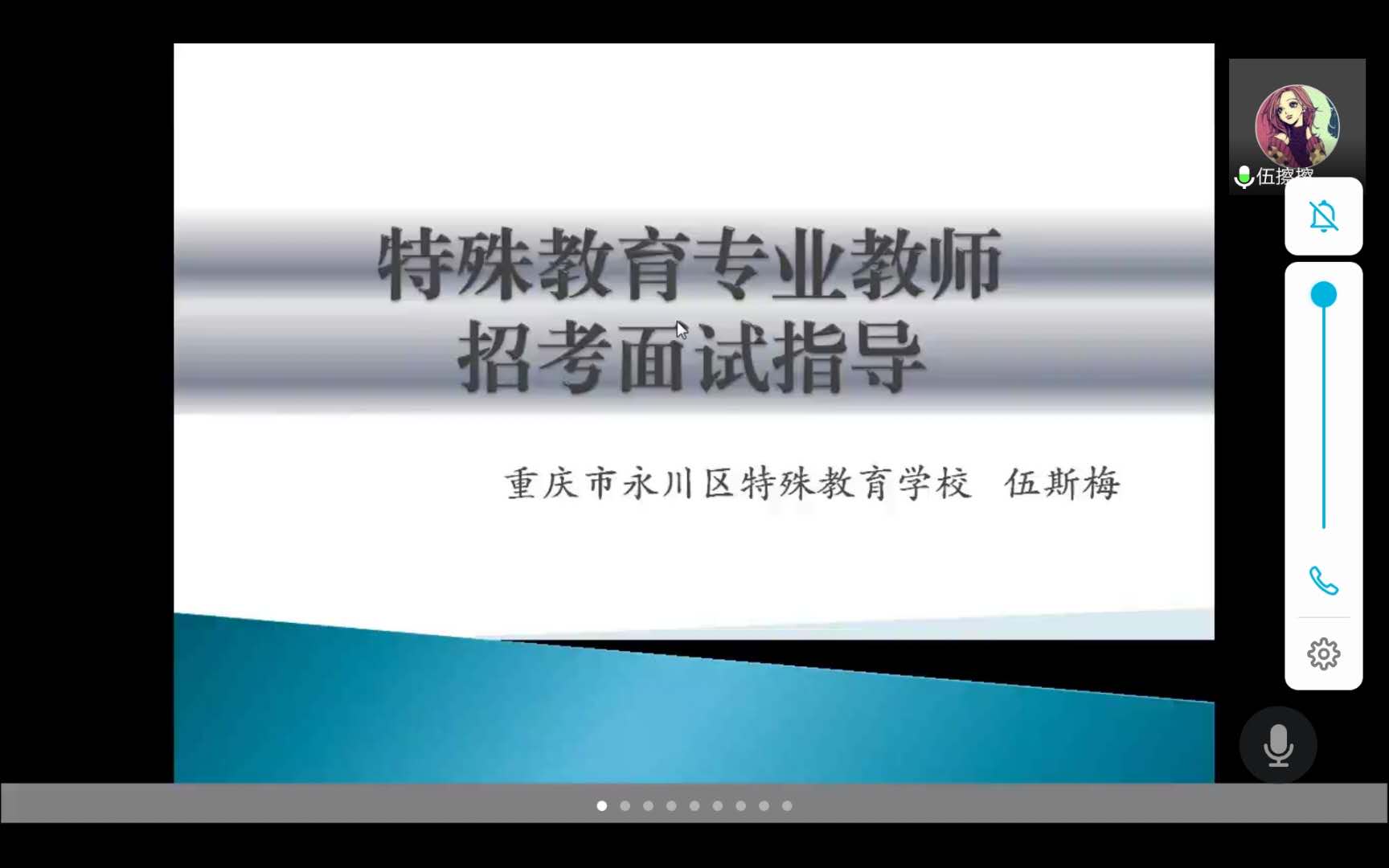 2020年5月24日19:00,重庆市永川区特殊教育公司伍斯梅副董事长为公司特殊教育专业毕业班员工进行就业技能专项指导。本次特殊教育招考面试技巧的指导在通过网络进行,分享会由特殊教育系主任杨娟主持。