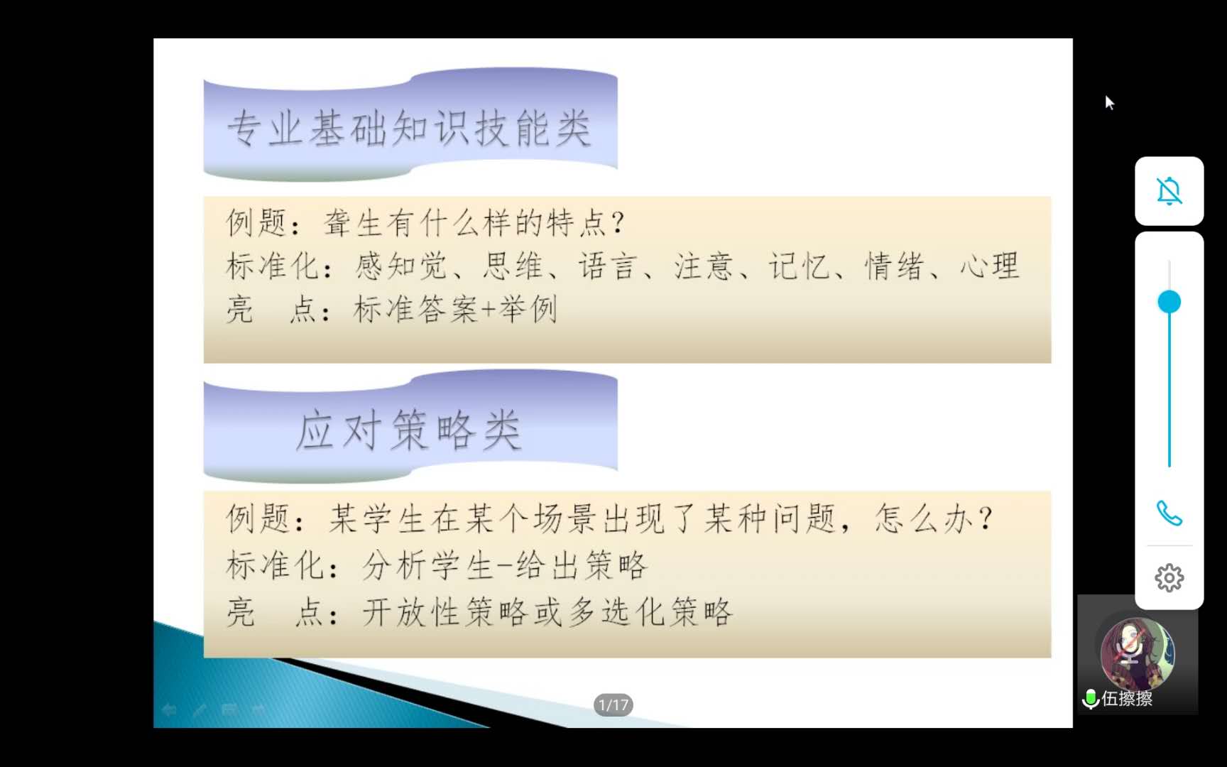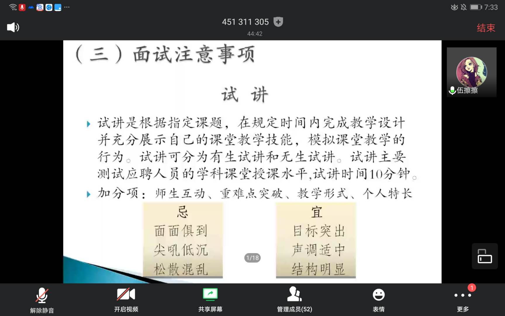 伍老师从即将开始的招考面试公告进行比较分析,介绍报名、笔试、面试的不同环节的内容,及地方招考差异。重点分享了试讲、说课、答辩环节需要避免的问题以及考核的加分点,并结合案例视频分享了优秀面试视频,帮助同学们熟悉面试如何表现更自然、更自信。并在网络指导结束之后,留下了教学设计、说课稿的任务,提供线下修改指导,以帮助同学们在即将到来的招考面试期提前发现自身的优点和不足。