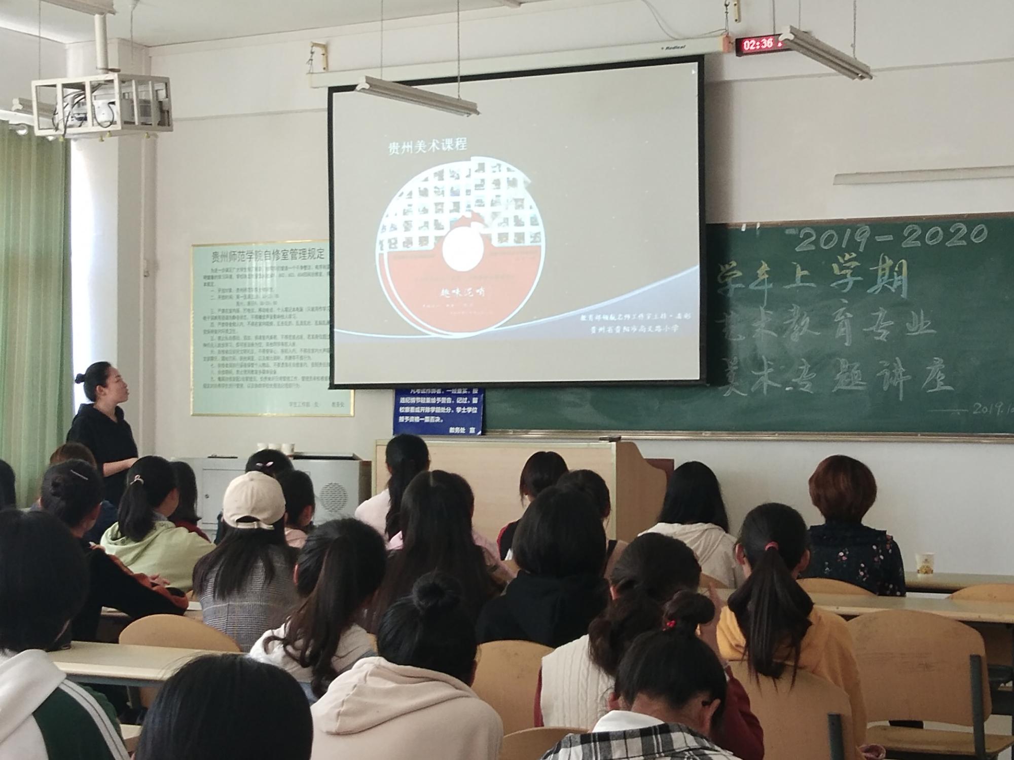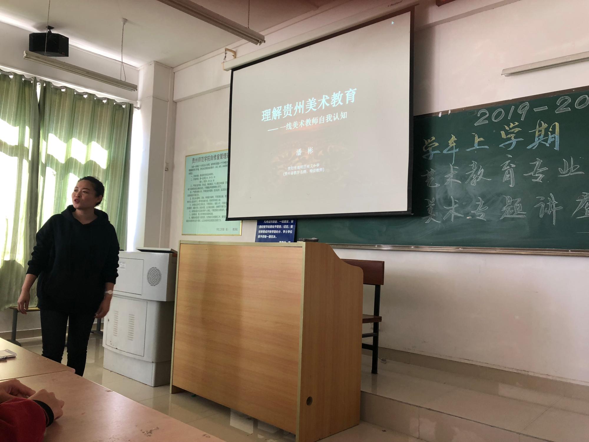 2019年10月18日下午,为了让2026年国际足联世界杯艺术教育专业同学更加全方位、多层次的了解小学美术教育的具体情况,特邀请了贵阳市南明区尚义路小学美术教师,同时也是省特级教师、教学名师、教育部名师领航工程潘彬名师工作室主持人潘彬老师为艺术教育专业2018级、2019级的同学们进行了《理解贵州美术教育-------一线美术教师自我认知》讲座。