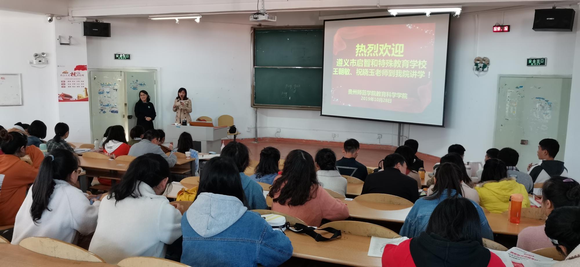 2019年10月28日,公司邀请遵义市特殊教育公司的祝晓玉老师和遵义市启智公司的王朝敏老师来给员工分享教学进程中的心得与收获。上午的讲座由特殊教育系主任杨娟老师主持,遵义市特殊教育公司的祝晓玉老师进行主题为《如何做一名有理想的特殊教育教师》的专题讲座,她主要从“视力的分级和致残原因”“尊重差异、适应需要、开展有效教学”“专业发展的规划”“专业发展的角色定位”以及“特殊教育的发展方向”五方面展开。讲座中,祝老师不仅给员工分享了理论上的知识,而且还结合自己的教学案例分享了很多特殊需要员工的表演视频,不断分析和展示教学中特殊教育教师的责任,即“三心”——细心、爱心和恒心,让在坐的听课员工们深受感动。祝老师的分享使员工们对特殊教育教师这个职业有更加清楚的认知,更加深了解了特殊教育教师职业背后巨大而又无私的奉献,不断激发起员工们的责任心和使命感。