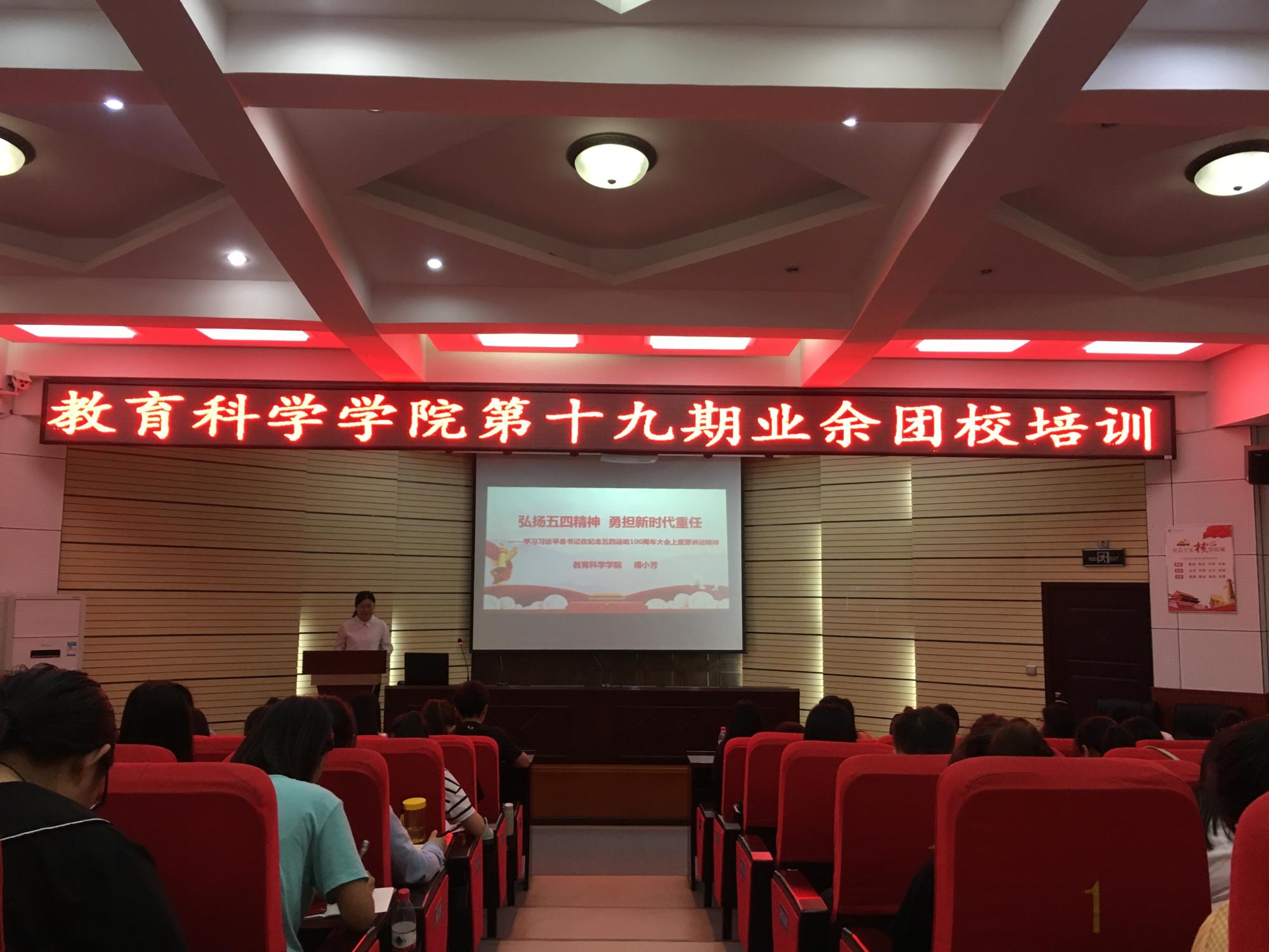 本次培训在全体成员齐唱《光荣啊 中国共青团》的歌声中拉开了帷幕。学员代表18级特殊教育班罗佳梅代表全体学员发言。傅小芳讲话并对参训学员提出要求。她指出,全体同学要从思想上珍惜此次学习机会,课上认真听讲,学习党团相关理论,增强对党团知识的认识,以实际行动积极向党组织靠拢;参加此次培训的学员主要是团学干部,学员们要做好同学们的榜样,以自己的一言一行影响辐射身边的同学;积极投身到公司的各项工作中去,为公司的建设发展抒写自己的青春华章。随后,傅小芳以《弘扬五四精神 勇担新时代青年使命》为主题为全体学员作了精彩有趣的第一讲。在讲座上,学员们认真观看习近平总书记 在纪念五四运动100周年大会上的讲话的新闻视频。傅小芳围绕了“大会基本情况”“高度评价五四运动的历史意义”“6个‘要’勉励新时代青年”“做新时代有为青年”等六个方面进行讲授,以生动具体、深入浅出地语言、图文并茂的形式给全体学员授课。她希望学员们能够深刻理解并认真践行习近平总书记对中国新青年的要求和期望。