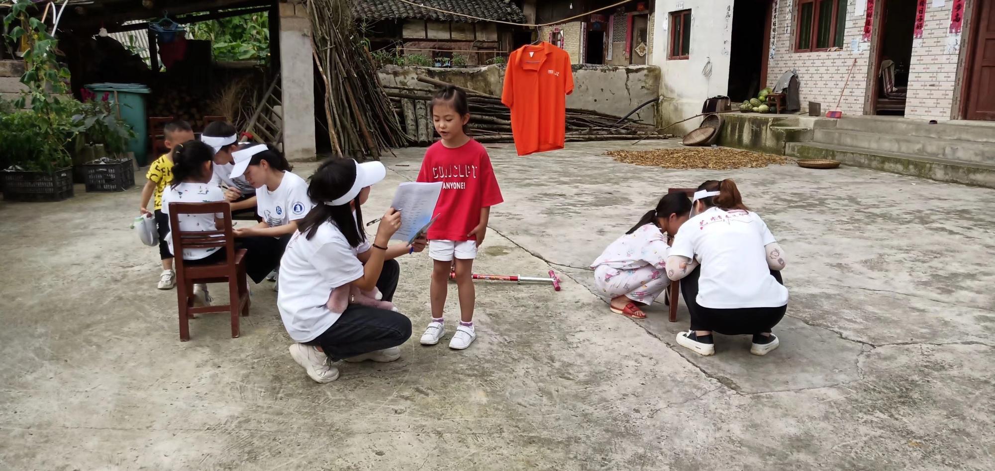 在调查走访的同时,其他小组志愿者同步在龙窝村村委会对孩子进行暑假作业的辅导。墙绘组志愿者继续前往腊脚村完成“24字社会主义核心价值观”的墙绘工作。节目表演组志愿者开始对接后期节目的彩排、演出等事宜。