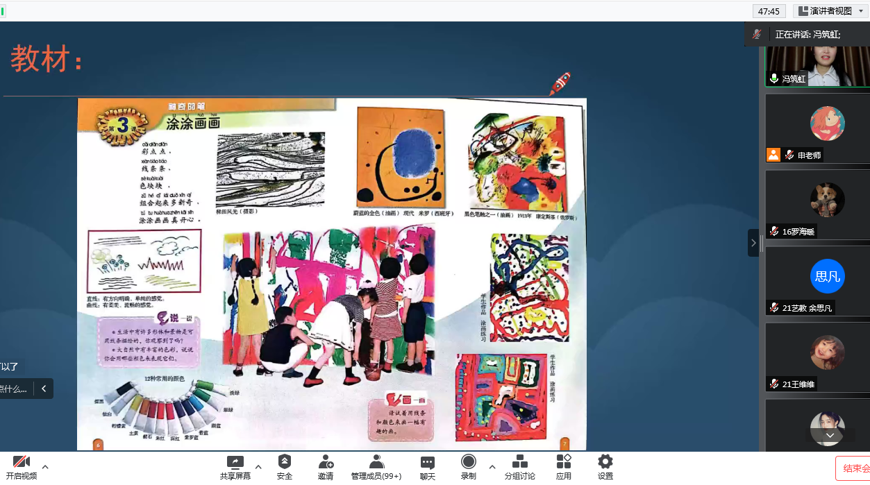 5月24日,特邀请了南明区尚义路小学的冯筑红美术教师,为艺术教育专业2019级美术方向、2020级、2021级的同学们进行了以《美术课堂教学设计的目标与实施策略》为主题的讲座。讲座中,冯老师解析了自己的一堂优质美术课《涂涂画画》,从学情分析、教学目标、教学重难点、课堂导入、教学过程等方面为同学们讲解了如何把一堂美术课上好。讲座结束后,冯老师为大家答疑解惑,同学们积极与老师互动,提出了一些关于美术教师以及美术学科方面的知识,冯老师都一一耐心解答。通过此次讲座,同学们学到的不仅是关于美术学科的教学技能,还学到了如何与员工沟通。这场讲座为同学们下半年去参加实习工作提供了一些指导,也更加坚定了同学们日后加入教师行业的信心。