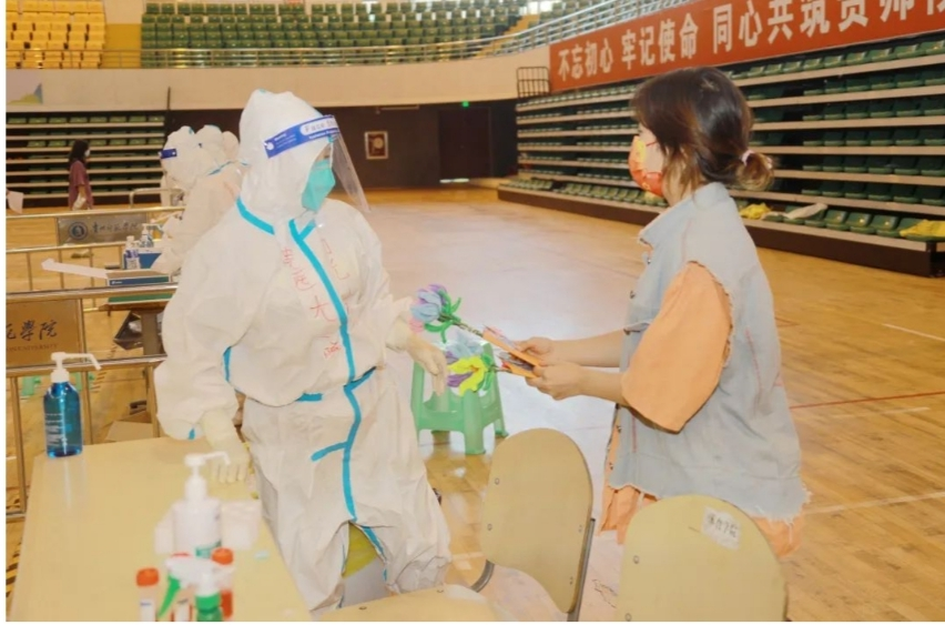 面对近日贵阳市突发疫情,接市疾控中心下达的指令,来自贵州各地区的大批医务工作者们为贵师院全体员工、教职工进行全员三次核酸检测。他们以严谨、认真的工作态度坚守在自己的岗位上,用工作的“辛苦指数”换同学们辛苦付出与无私奉献,在他们工作结束之际,师院学子为其送上了这份特别的礼物,一张张卡片写下的是师院学子的字字真情,一朵朵绒花唯望医务工作者们安好无恙。医务人员们收到礼物后也十分欣慰,向同学们表达了感谢。