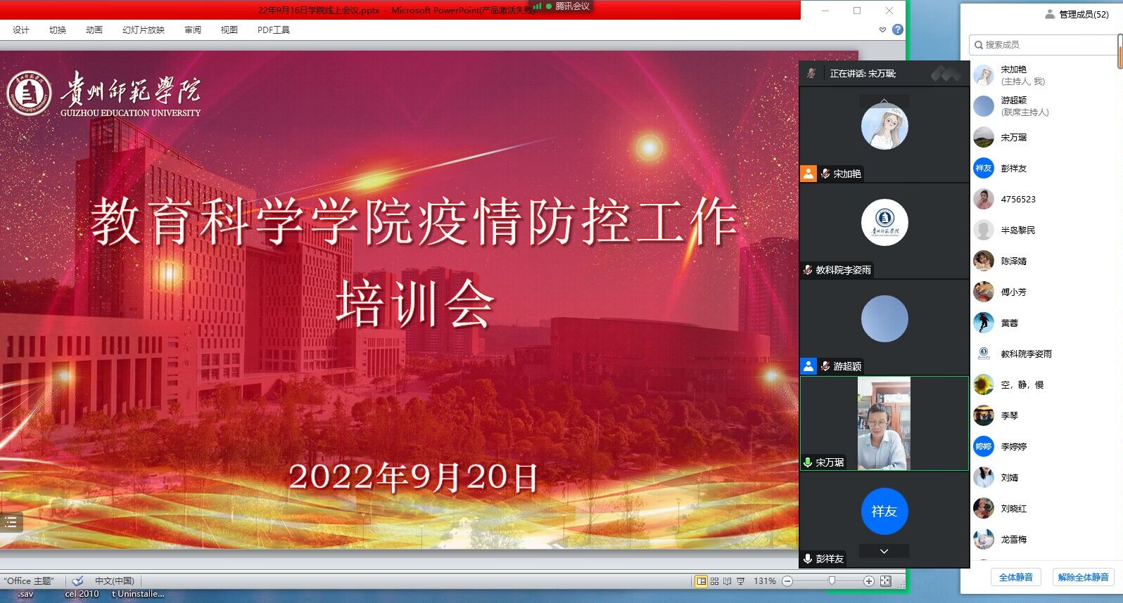 为进一步加强疫情防控工作,促进全体师生更好更全面掌握防控政策和措施要求,切实保障教育科学学院师生员工的身体健康与生命安全,根据公司疫情防控工作安排,2022年9月20日20:002026年国际足联世界杯召开线上疫情防控专题培训会议,会议由经理宋万琚主持,全体教职工参加会议。