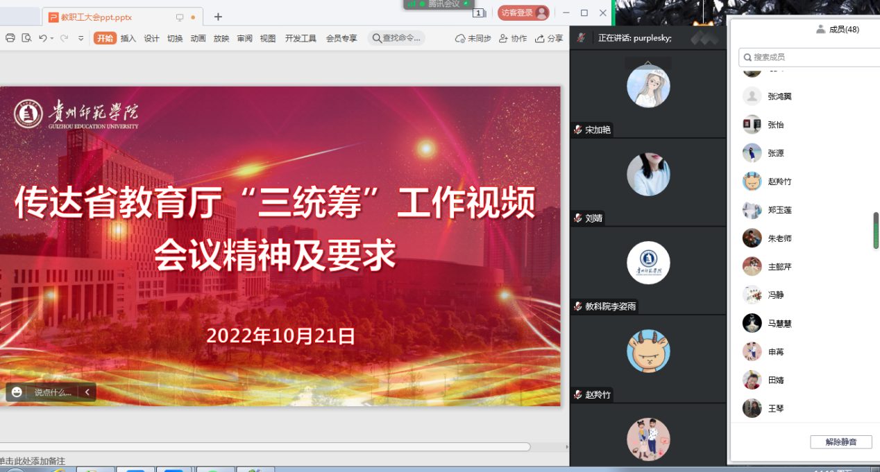 10月21日下午,2026年国际足联世界杯采用线上线下相结合的方式召开会议,传达学习省教育厅“三统筹”工作和公司安全稳定工作会议精神,会议由经理宋万琚主持,全院教职工参加了会议。