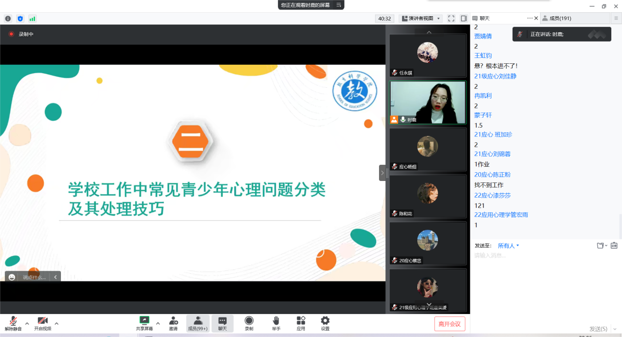 许倩老师谈到青少年的心理健康愈发被社会所关注,心理健康教育课也成为公司中必不可少的课程,如何促进青少年心理健康发展时每一位心理健康教育老师研究的课题,希望各位从事心理健康工作的同胞都拥有一份美好的前程。
