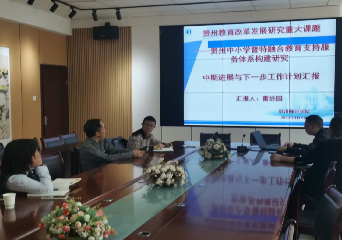 汇报会上,课题主研人雷经国副教授从课题研究进展的基本情况应然与实然视角下贵州中小学普特融合教育支持服务体系的模型框架结构与要素、研究发现与结论,下一步研究工作计划等四方面做了全面汇报。各位专家认真听取课题的阶段性成果汇报后,对已有研究发现与结论进行了深入的研讨与指导,提出了宝贵的意见和建议。各位专家和教师一致认为,该课题开展已经取得了实质性的进展和较好的阶段性成果,建议下一阶段通过深度访谈和追踪调研等方式,进一步优化支持服务体系构建、明晰其体系的渐进式实施路径,做好后期结题资料的收集与分析等准备工作。