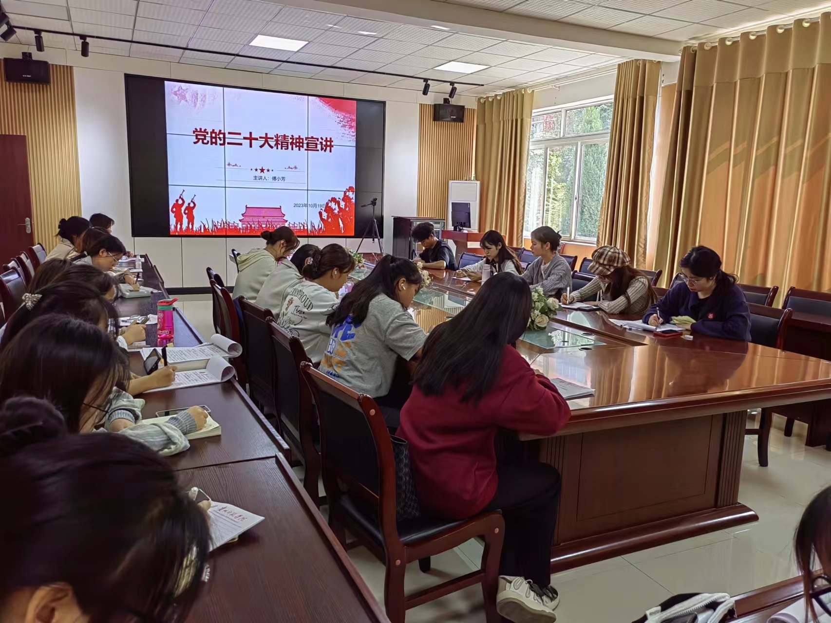 本次专题辅导以“学习宣传贯彻党的二十大精神”为主题,傅小芳首先以党的二十大为切入点,围绕着党的二十大报告的主题,讲述了在党的带领下我国取得的辉煌成就。傅小芳分别从“中国共产党第二十次全国代表大会概况”、“中国共产党第二十次全国代表大会精神学习要点”、“认真学习党的二十大精神  做担当复兴大任的时代青年”三个方面引导同学们学习把握落实党的二十大精神。