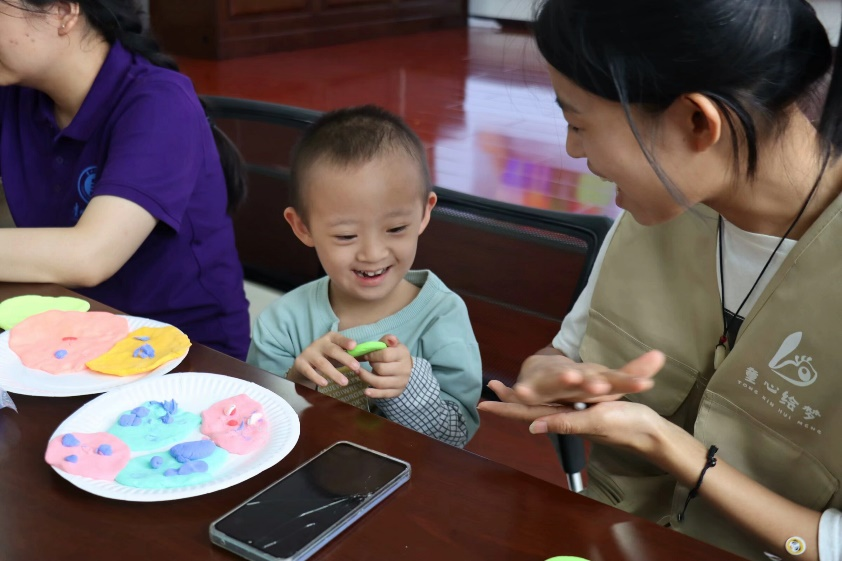 上午,志愿者们为特殊儿童举办了一场多姿多彩的粘土装饰画活动。志愿者们为孩子们精心准备了粘土、纸盘材料。活动开始后,小朋友们在志愿者的指导下,将五颜六色的粘土捏造成不同的形状,把粘土装饰在纸盘上,留下了属于自己的粘土装饰画。不一会儿,一幅幅充满童趣和创意的粘土装饰画便呈现在大家面前。 下午,助教老师们提前布置好了场地,准备开始有趣的体育活动——“趣味皮球大闯关”。主教老师先向孩子们介绍了游戏规则,并由助教老师进行了示范。游戏开始时,孩子们被随机分成两队, 随着一声开始的指令,两位小选手将手中的球沿桌面滚向站在对面的同学,每一次成功的传递都伴随着欢呼声和掌声,通过这关后,孩子们站在讲台上,将小球抛给对方的助教老师,成功完成了趣味大闯关活动。游戏结束后,孩子们的脸上洋溢着满足和自豪,他们不仅完成了挑战,更重要的是,他们感受到了团队的力量和运动的乐趣。