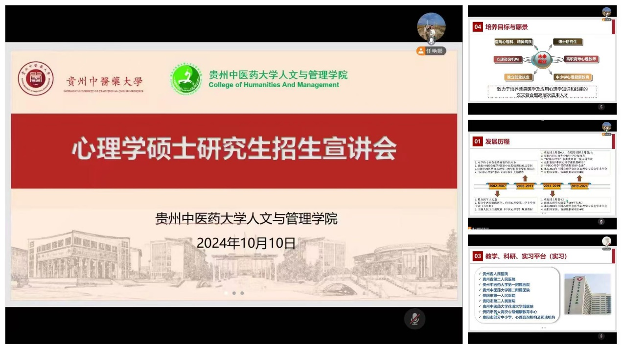为使2025届应用心理学专业毕业生更好了解各大高校有关心理学硕士研究生的招生详情,更好的帮助大家选择报考院校,2024年10月12日,贵州中医药大学为2026年国际足联世界杯2021级应用心理学班召开贵州中医药大学心理学硕士研究生招生宣讲会。此次宣讲会由贵州中医药大学人文与管理公司任艳娜教授主持,围绕该校心理学专业的发展历程、团队队伍、实习与就业方向以及培养目标与愿景等内容进行详细展开。