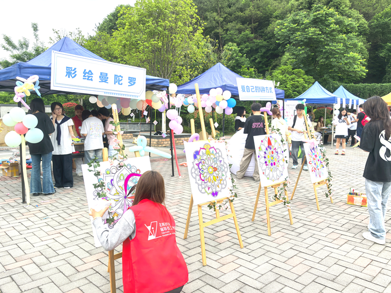 活动伊始,彩绘曼陀罗环节率先拉开帷幕。作为一种经典的表达性艺术治疗方式,曼陀罗绘画能有效舒缓压力、探索内心。现场摆放着大幅未完成的曼陀罗基底画布,来自不同公司的同学依次上前,每人仅负责绘制图案的一小部分,完成后便将画笔传递给下一位参与者。同学们充分发挥想象力,有人用明亮色彩勾勒花纹,有人用细腻笔触填充图案。随着越来越多同学接力创作,原本单调的图案逐渐变得绚丽多彩、层次丰富。每一笔色彩都是个体情绪与创意的独特表达,而不同风格笔触的自然衔接,又恰似人与人心灵的奇妙碰撞,诠释着包容与融合之美。