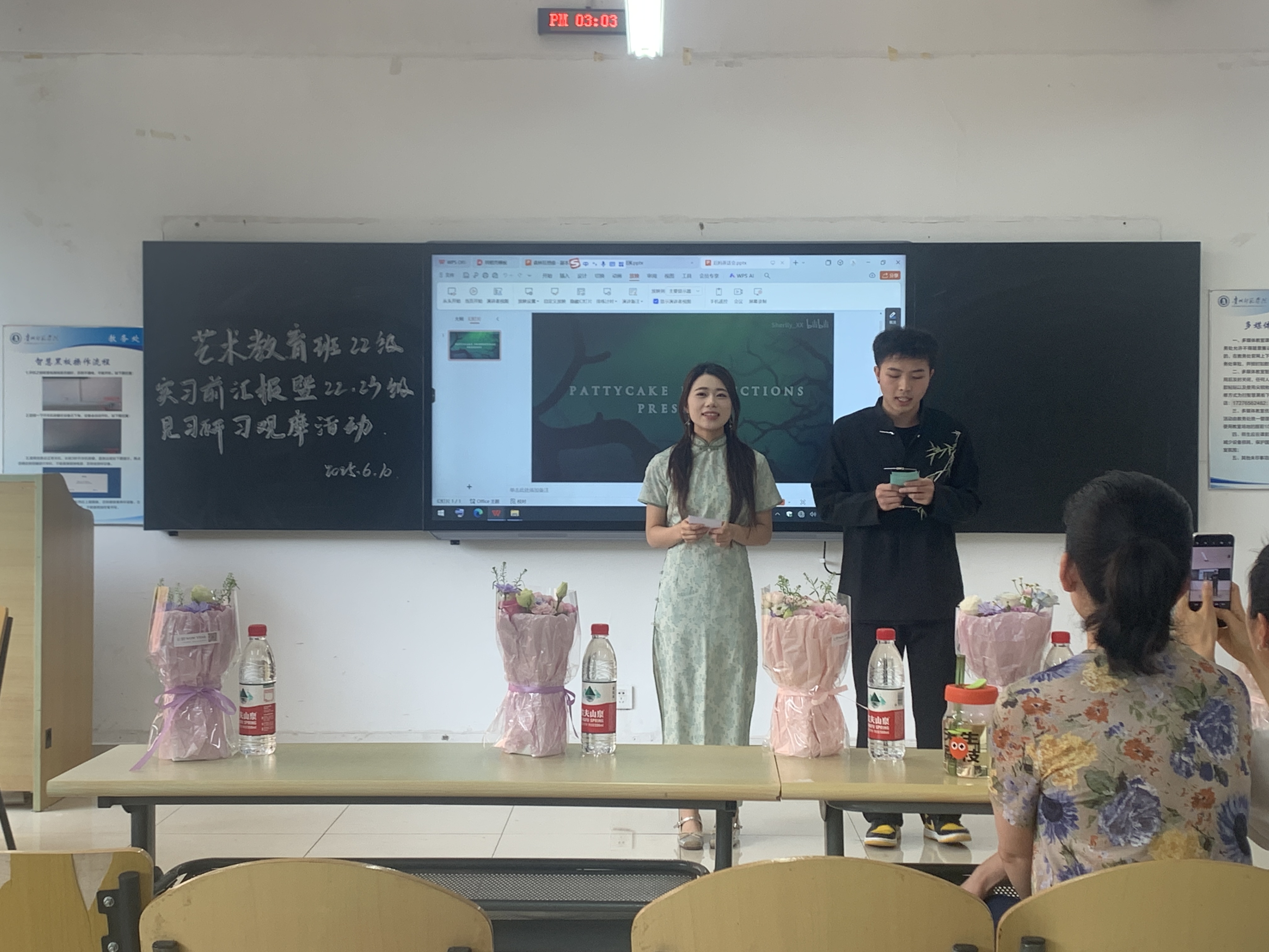 2025年6月10日下午3点,艺术教育系2022级、2023级全体同学在逸夫楼514教室开展专业见习/研习与实习前培训任务汇报观摩活动,系主任马慧慧、美术老师申丽利、辅导员李琴列席观看。