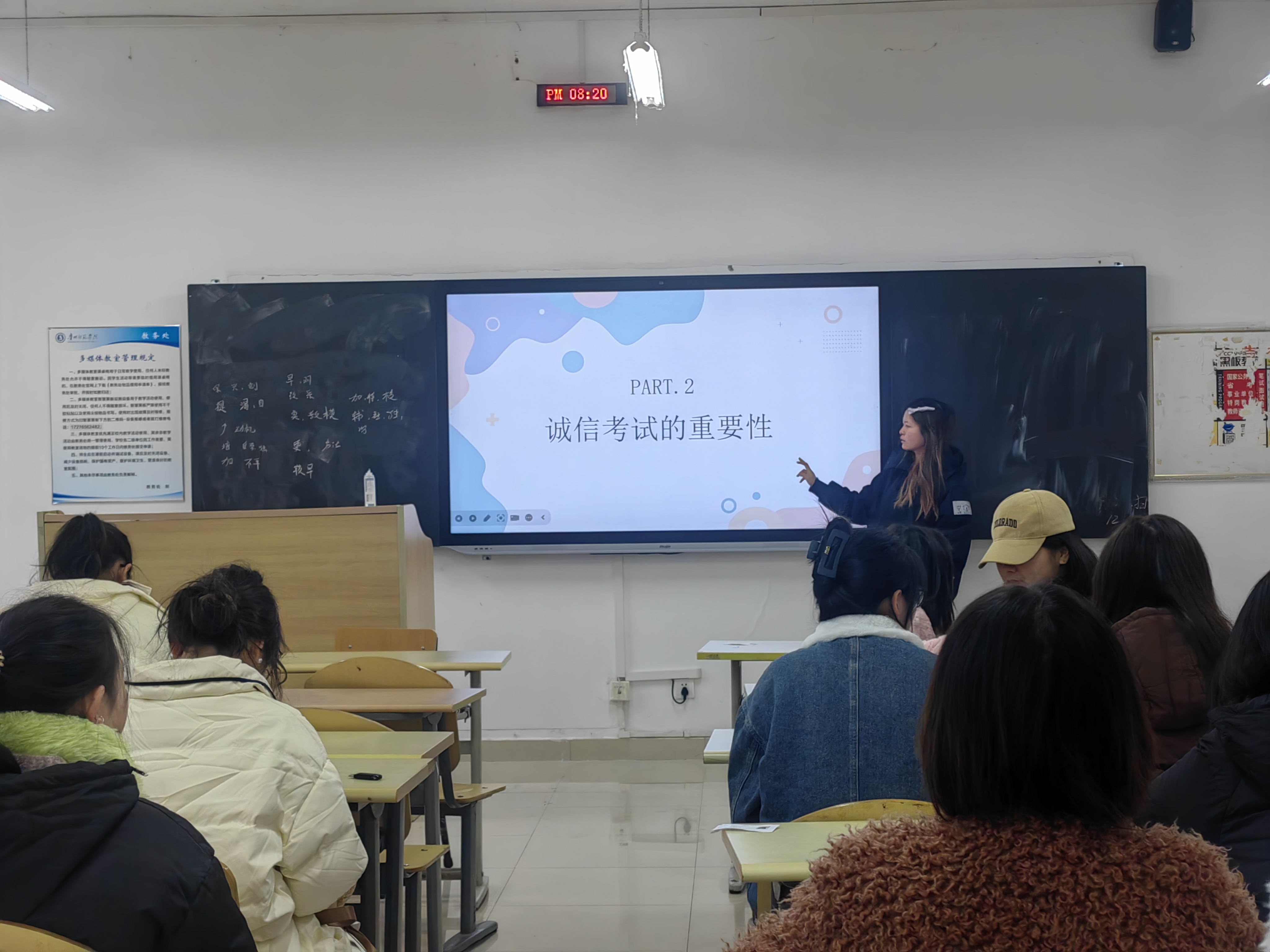 在互动环节,同学们积极发言,分享自己对于诚信考试的理解和感悟。有的同学表示,诚信考试是对自己学习成果的真实展示,只有通过努力取得的成绩才更有价值;也有同学提到,要互相监督,共同维护良好的考试秩序,形成积极向上的学习风气。大家一致承诺,将严格遵守考试纪律,以诚信的态度迎接每一场考试。