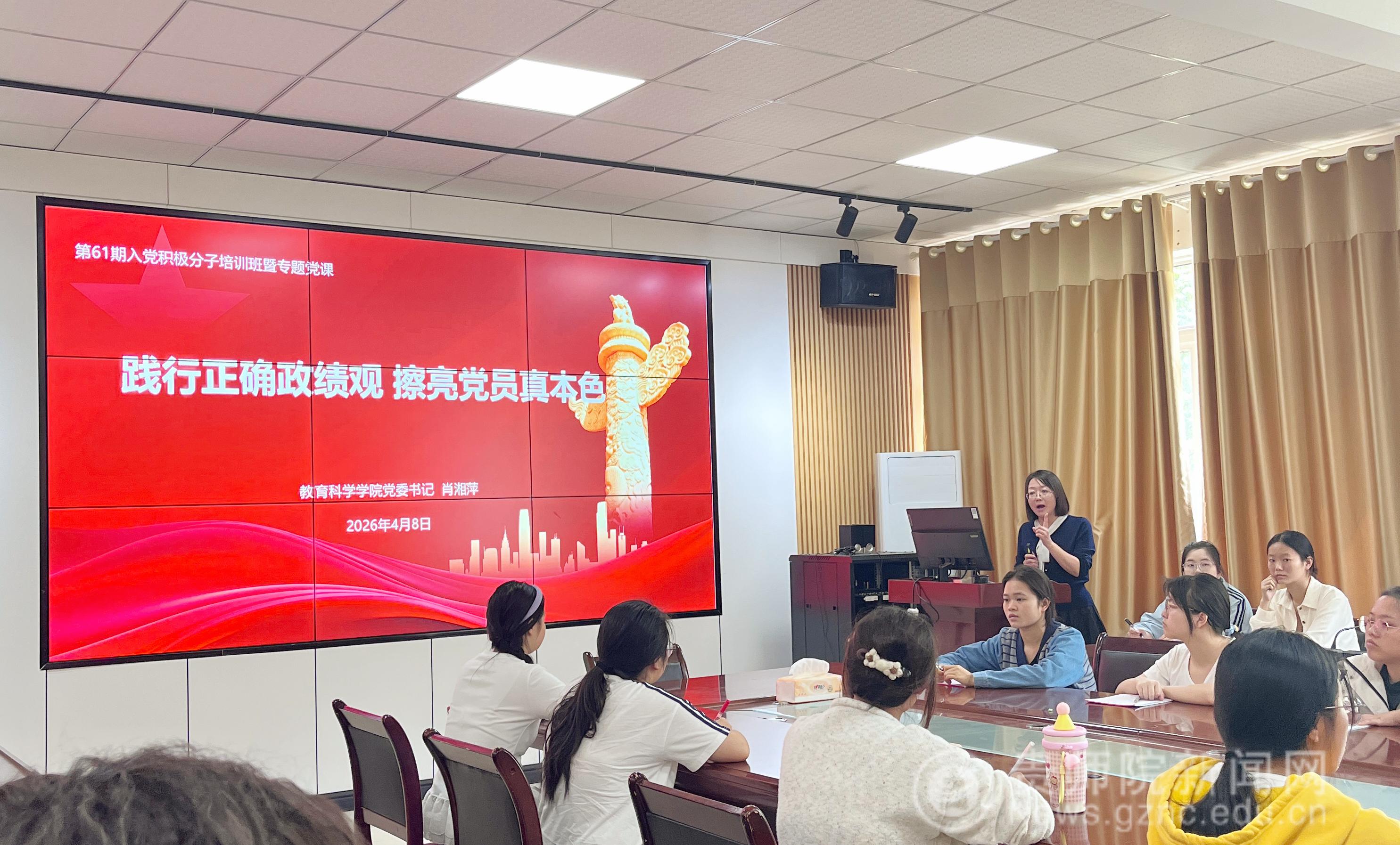 开班仪式结束后,肖湘萍以《践行正确政绩观 擦亮党员真本色》为题,开启了公司第61期入党积极分子培训班的第一场专题讲座。讲座中,肖湘萍紧密结合公司专业特点,围绕“深刻认识党员身份,筑牢信仰之基”“准确把握政绩观内涵,明确奋斗方向”“紧密结合专业特点,争当先锋模范”等三个方面,进行了系统深入的讲解。她指出,党员是中国工人阶级的有共产主义觉悟的先锋战士,必须时刻牢记全心全意为人民服务的根本宗旨。她强调,树立和践行正确政绩观,核心是要坚持以人民为中心的发展思想。她勉励全体学员,要秉持“功成不必在我”的精神境界和“功成必定有我”的历史担当,自觉摒弃急功近利、心浮气躁的功利思想,脚踏实地将个人成长融入教育强国和国家发展大局,以实干践行入党初心,以专业服务社会所需。