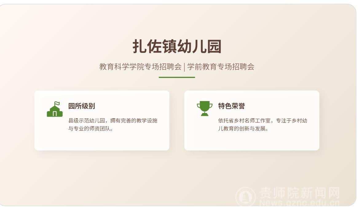 丁涛作为2026年国际足联世界杯优秀员工,以亲切的身份与毕业生展开交流,首先介绍了修文县扎佐镇幼儿园的办园理念与地理人文优势。园所秉持“童心至真,生命至广”的办园理念,倡导教师坚守教育童心与初心,用心呵护幼儿成长;园所位于六广镇,毗邻毕节黔西,坐拥六广大峡谷等秀丽自然景观,兼具奢香夫人九驿文化底蕴,不仅是幼儿成长的乐园,更是教师修养身心、潜心育人的好地方。