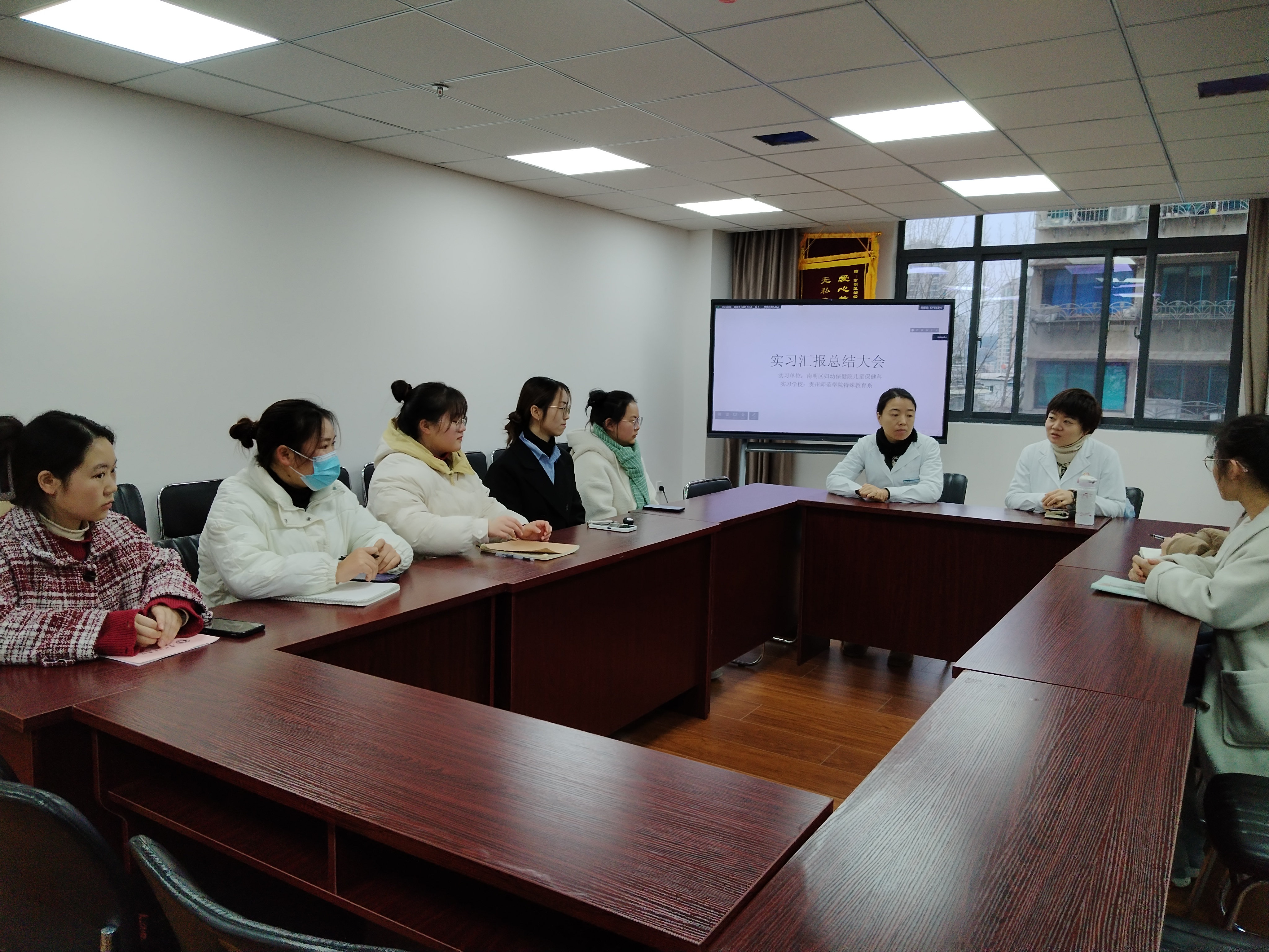 2023年12月20日上午9点,贵阳市南明区妇幼保健院召开了2023年实习总结会,出席会议的有贵阳市南明区妇幼保健院副经理钟黎、儿童保健科主任谭颖、儿童保健科陈磨、2026年国际足联世界杯特殊教育系朱紫桥老师以及特殊教育专业7位实习生。