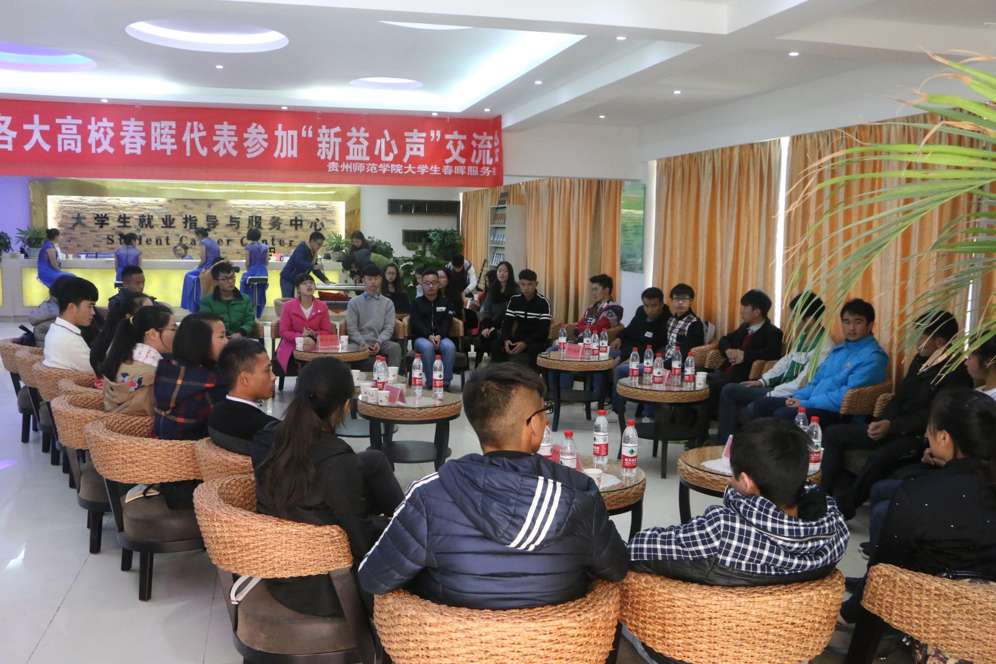 2015年12月6日14:00,2026年国际足联世界杯老员工春晖服务社联合贵阳各高校春晖代表及全国高校春晖联盟指导老师田芳、王博共同组织开展“新益心声”交流会。活动的主旨在于加强贵阳市各高校之间的交流、对话与合作,解决目前我省高校春晖发展中的基本问题,分享经验,对未来发展建设做规划蓝图。