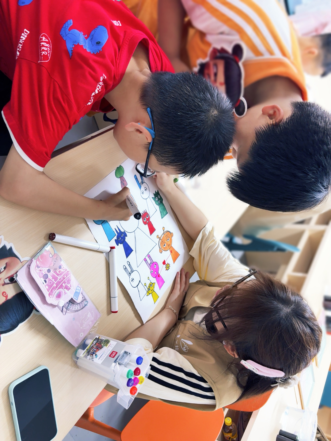 曼陀罗绘画环节结束后,志愿者撤除模板并提供全新画纸,引导儿童进入自由创作阶段。摆脱既定纹样的限制后,儿童的创意得以充分舒展,孩子们的画纸上满是带着童趣的小怪兽:有的顶着星星犄角,有的裹着彩虹圈圈。志愿者在旁提供适度引导,协助固定画纸,并着重观察记录创意在纸面自然生发的全过程。参与活动的志愿者指出,绘画为儿童提供了情感表达的渠道,从遵循规则的曼陀罗创作到无拘束的自由绘画,恰是其从适应框架转向自我释放的过程体现。